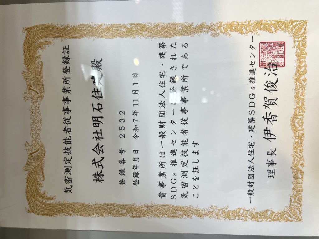 このたび、当社は正式に「気密測定技能者従事事業所」として登録されました!