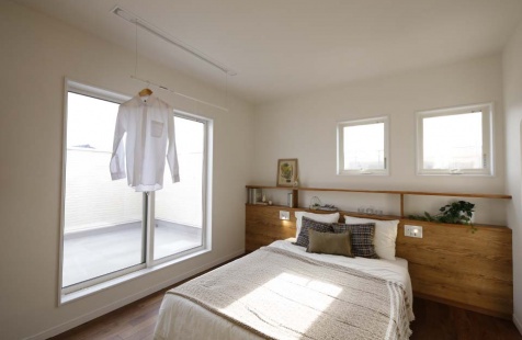 造作の棚と、可動式の物干し棒で機能的な主寝室