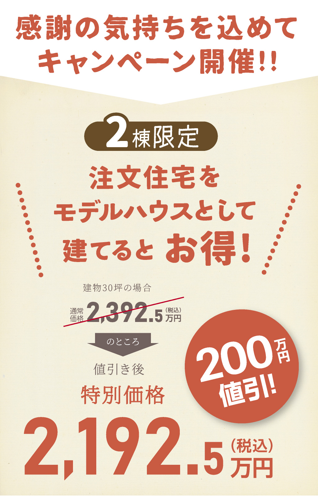 あなたのご自宅を一定期間モデルハウスとして使用させて頂く事で注文住宅をお安く建てる事ができます。