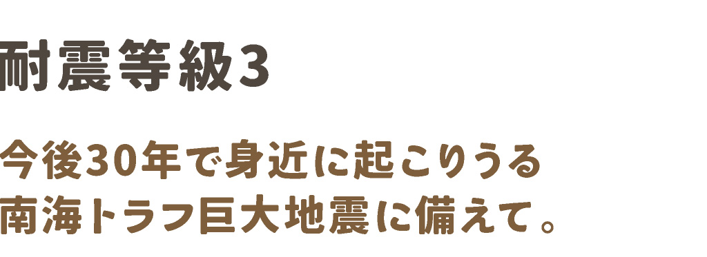 数百年に1度程度の巨大地震でも壊れないことを建築基準法としており、一般的な住宅は等級1で建てられています。学校や避難所などの公共施設は等級2、IKU-REARの家は国内最高の等級3で、消防署や官公庁などと同等レベルの耐震性能です。